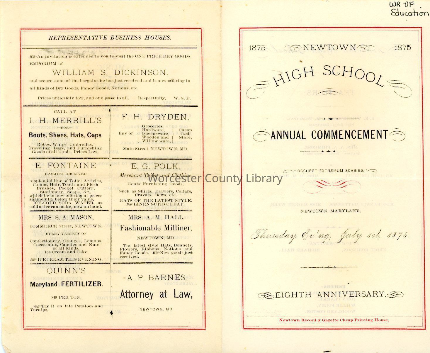 Mrs. A. M. Hall, fashionable milliner, Newtown, MD. The latest style hats, bonnets, flowers, ribbons, notions and fancy goods. New goods just received.