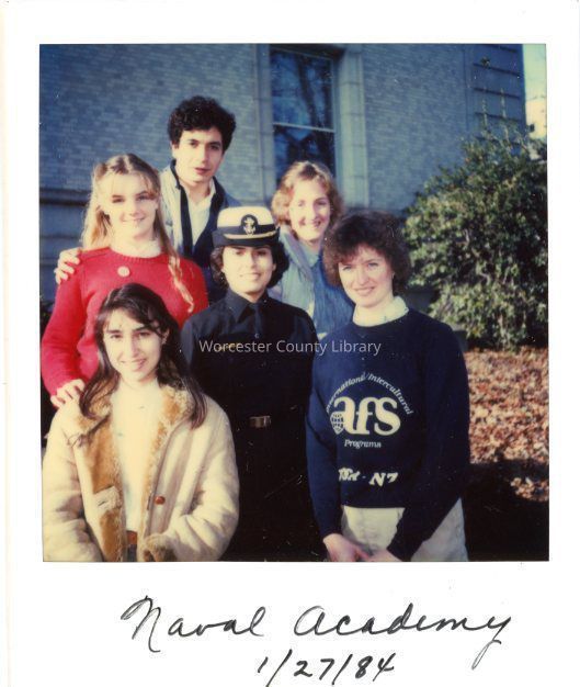 Photograph of Rita Barchetti, Leslie Murray, Janette, Nelson Hincatie, Susan Gibb, Ann Glovier, and Carmen Graciela Melgarejo at Naval Academy, Jan 1984Entry/Object ID