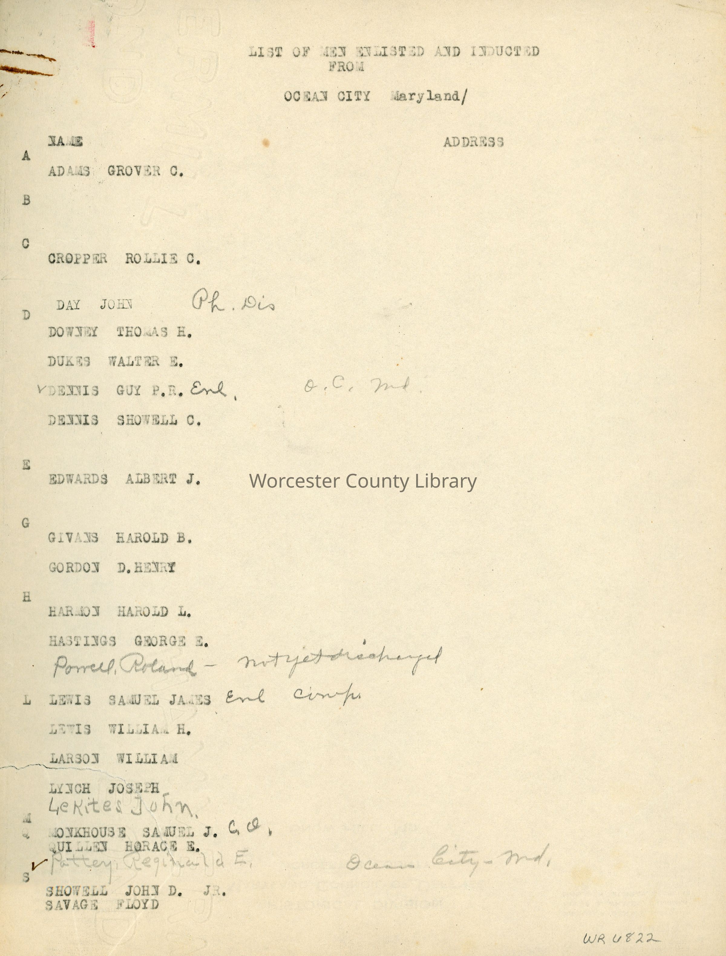 List of Men Enlisted and Inducted from Ocean City, Maryland, World War IEntry/Object ID