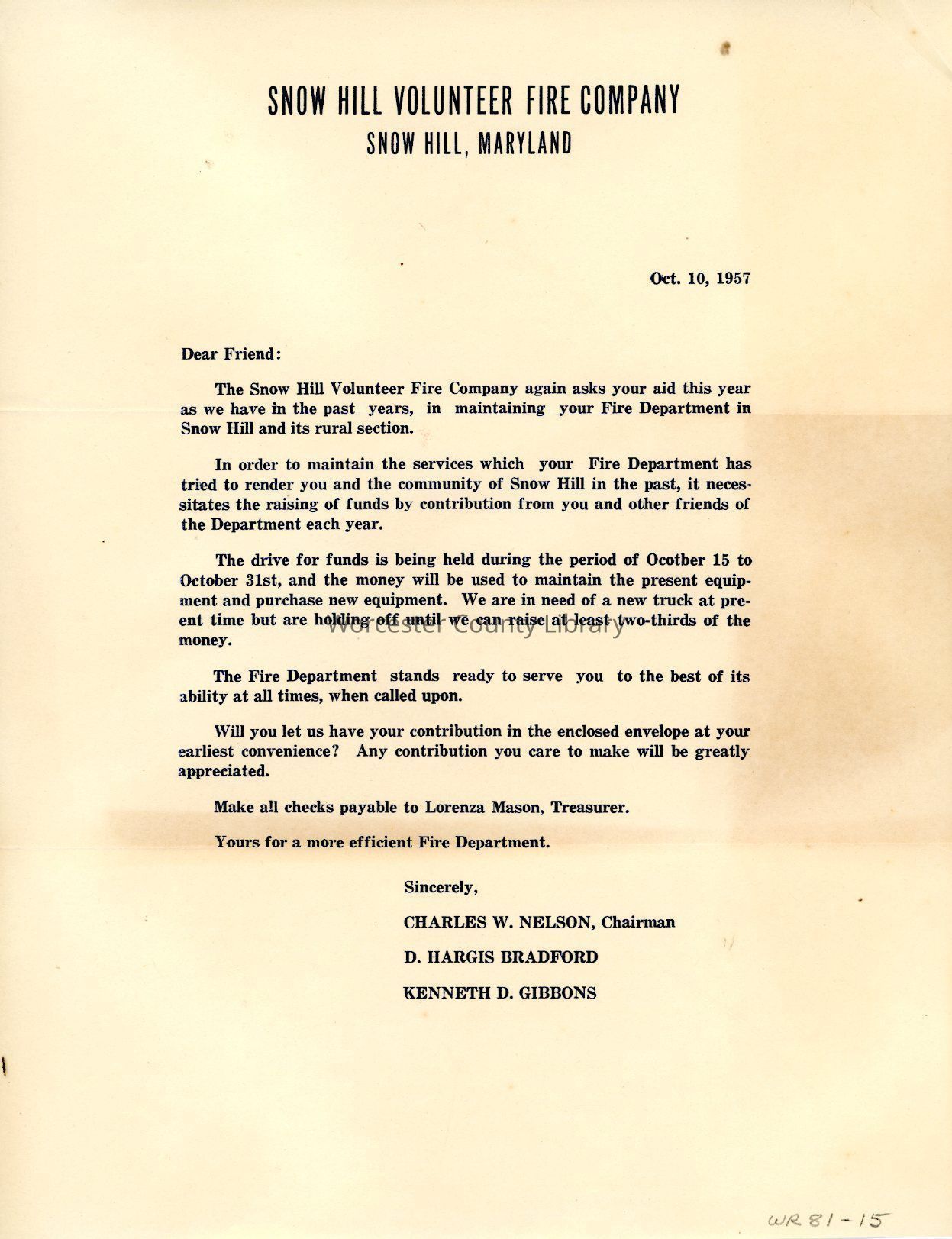 Fundraising letter, Snow Hill Volunteer Fire Company, Oct. 1957Entry/Object ID
