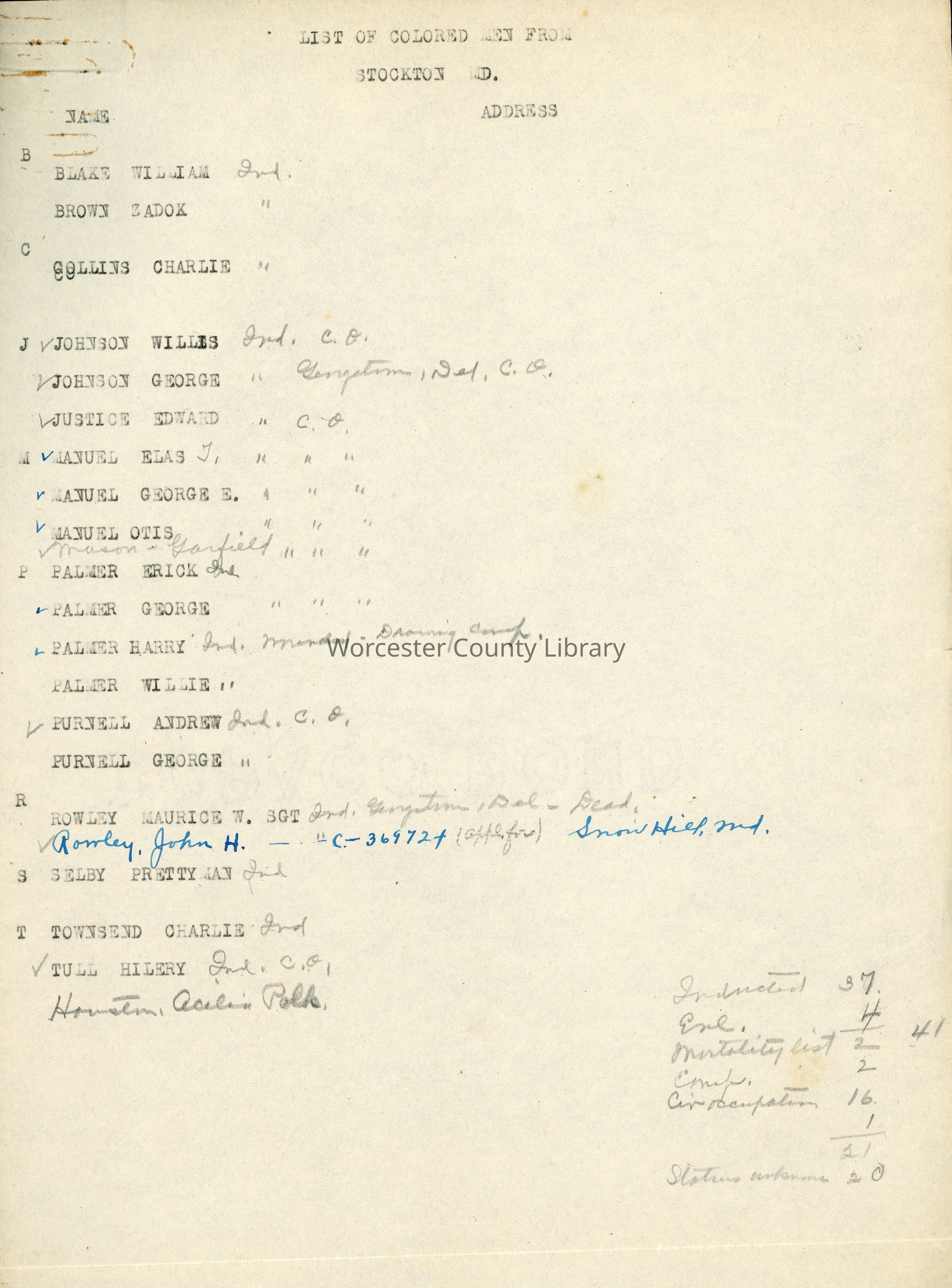List of Colored Men from Stockton, MD., World War IEntry/Object ID
