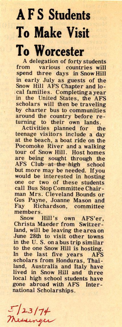Newspaper clipping, “AFS Students to Make Visit to Worcester” May 23, 1974Entry/Object ID