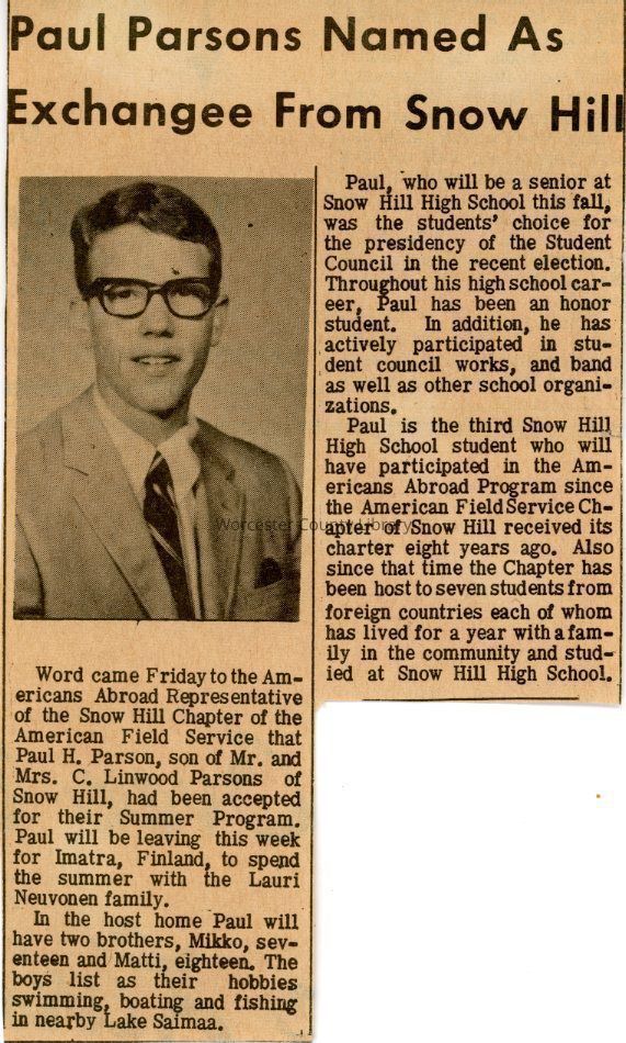 Newspaper clipping, “Paul Parsons Named as Exchangee From Snow Hill,” 1968Entry/Object ID