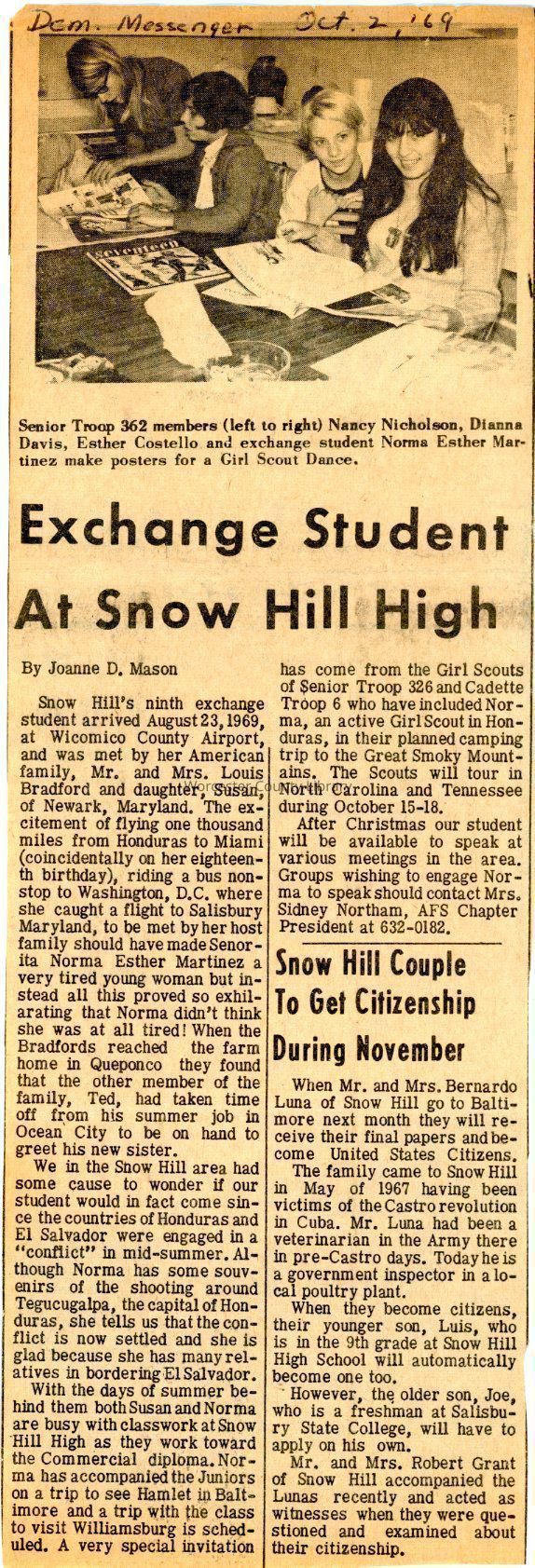 Nancy Nicholson, Dianna Davis, Esther Mary Costello Chan Chapman, Norma Esther Martinez Angeles Cherrix, Joanne Dickerson Mason, Louis Bradford, Mrs. Louis Bradford, Susan Bradford, Robert Grant, Mrs. Robert Grant, Bernardo Luna, Mrs. Bernardo Luna, Joe Luna, Luis Luna, Virginia Jewell Burge Northam, Snow Hill High School, Wicomico County Airport, Girl Scouts of America