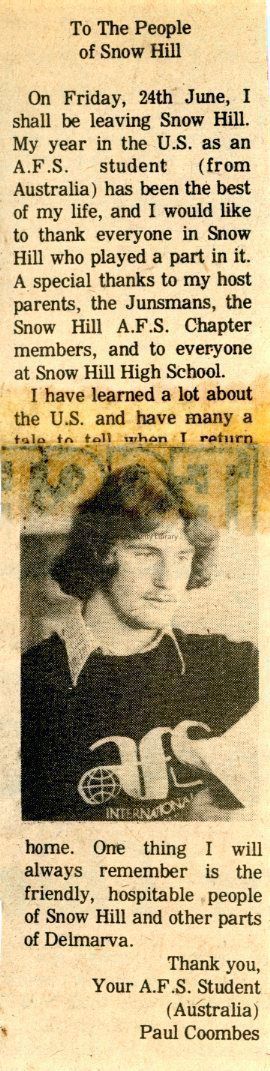 Newspaper clipping, “To the People of Snow Hill,” Paul Coombes, June 1977Entry/Object ID