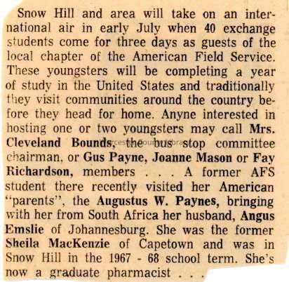 Pauline Ellen Cropper Bounds, Angus Emslie, Sheila Margaret Mackenzie Emslie, Joanne Dickerson Mason, Augustus William Payne, Elizabeth Aline Mumford Payne, Fay Richardson, American Field ServiceRelated Places