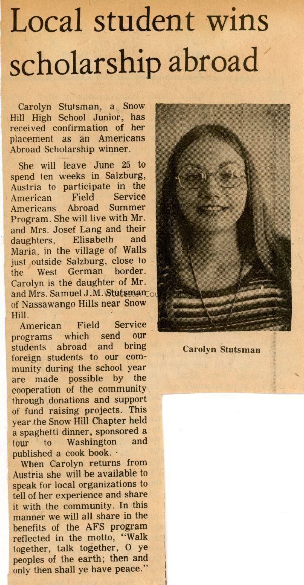 Elisabeth Lang, Mrs. Elisabeth Lang, Josef Lang, Maria Lang, Carolyn Jean Stutsman Porter, Ila Jean Mankamyer Stutsman, Samuel J. Miller Stutsman, Snow Hill High School, American Field ServiceCreated By