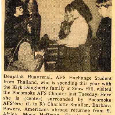 Benjalak Huayreral, AFS Exchange Student from Thailand, who is spending this year with the Kirk Daugherty family in Snow Hill, visited the Pocomoke AFS Chapter last Tuesday. Here she is (center) surrounded by Pocomoke AFS'ers: (L to R) Charlotte Smullen, Barbara Powers, Americans abroad returnee from S. Africa, Mona Hoffman, Chapter Secretary, Agnes Powers and Gordon Ritchie.