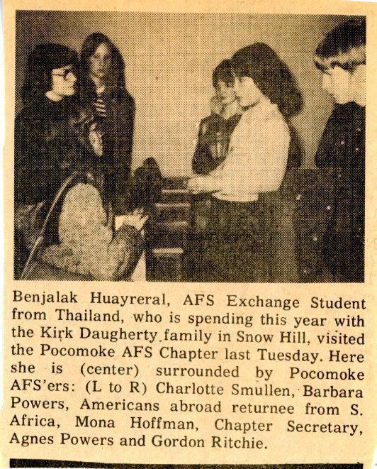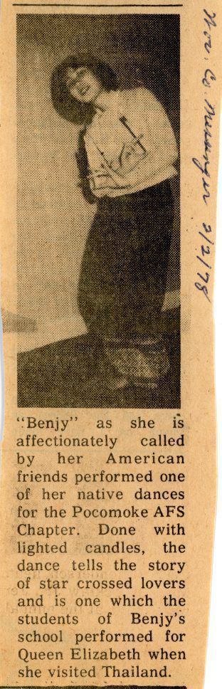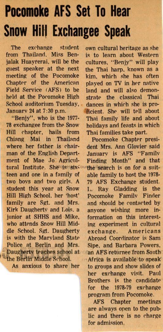 "Benjy", who is the 1977- 78 exchangee from the Snow Hill chapter, hails from Chiang Mai in Thailand where her father is chairman of the English Department of Mae Jo Agricultural Institute. She is sixteen and one in a family of two boys and two girls. A student this year at Snow Hill High School, her 'host' family are Sgt. and Mrs. Kirk Daugherty and Lois, a junior at SHHS and Mike, who attends Snow Hill Middle School. Sgt. Daugherty is with the Maryland State Police at Berlin and Mrs. Daugherty teaches school at the Berlin Middle School.