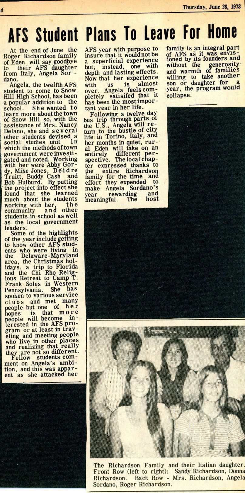 Newspaper clipping, “AFS Student Plans to Leave for Home” (Angela Sordano ), June 28, 1973Entry/Object ID
