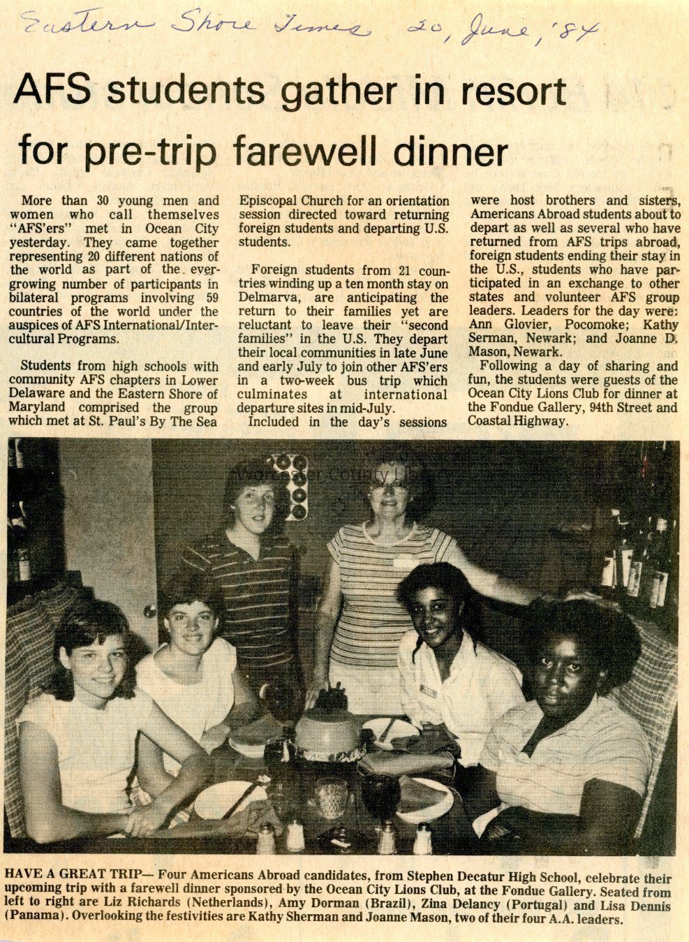 Newspaper clipping, “AFS students gather in resort for pre-tip farewell dinner,” June 20, 1984Entry/Object ID