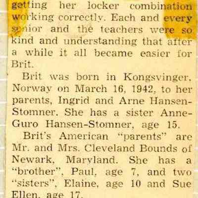 Brit was born in Kongsvinger, Norway on March 16, 1942, to her parents, Ingrid and Arne Hansen-Stomner. She has a sister Anne-Guro Hansen-Stomner, age 15.
