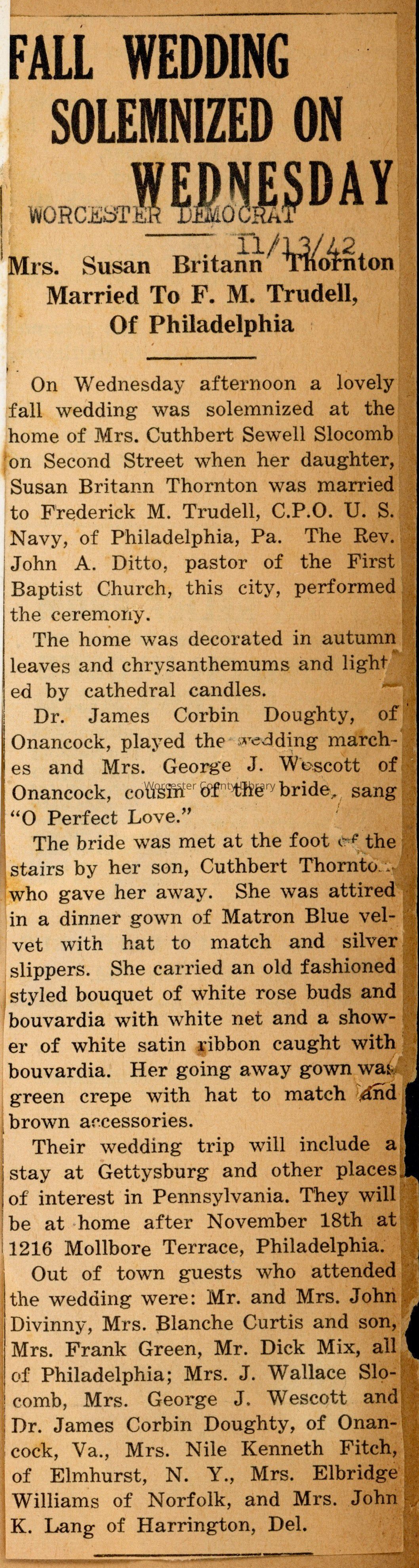 Newspaper clipping titled "Fall Wedding Solemnized on Wednesday" from the Worcester Democrat, November 13, 1942. Describes wedding between Mrs. Susan Britann Thornton and Frederick M. TrudellCollection