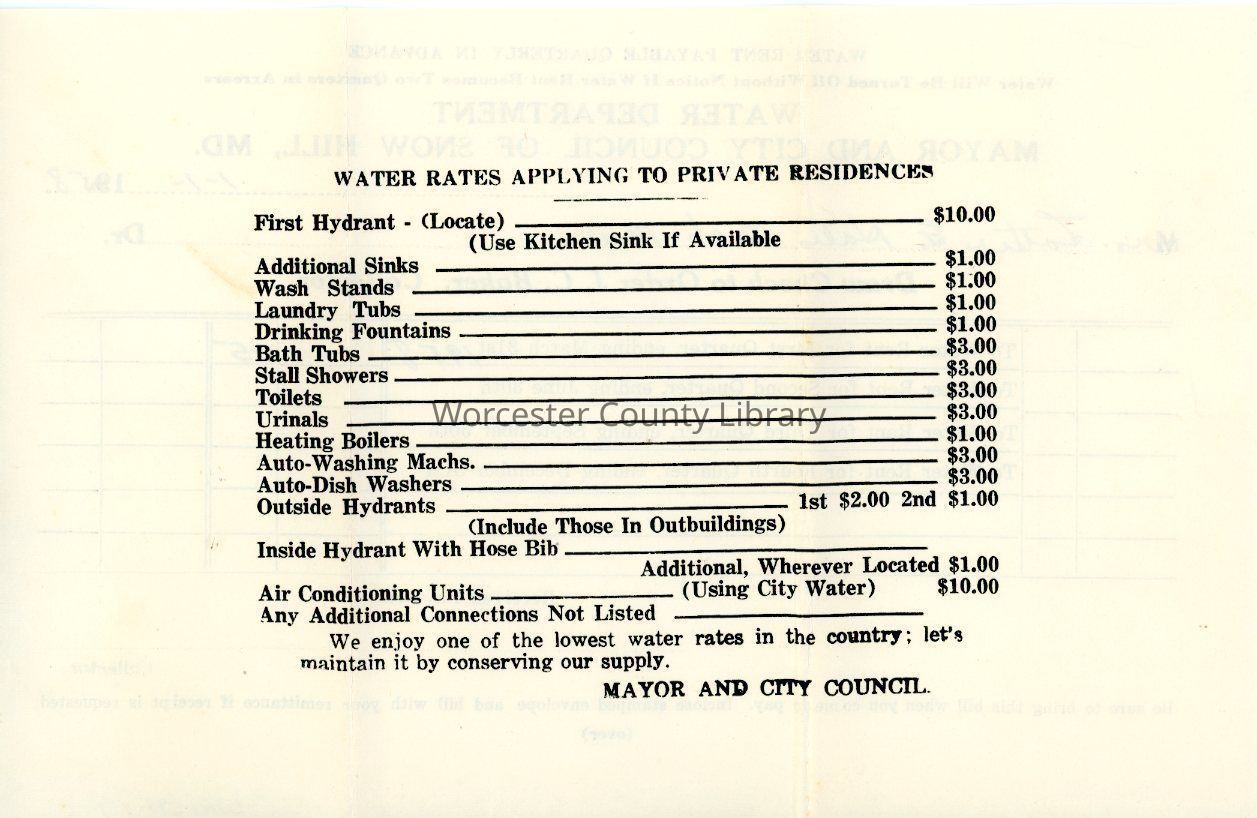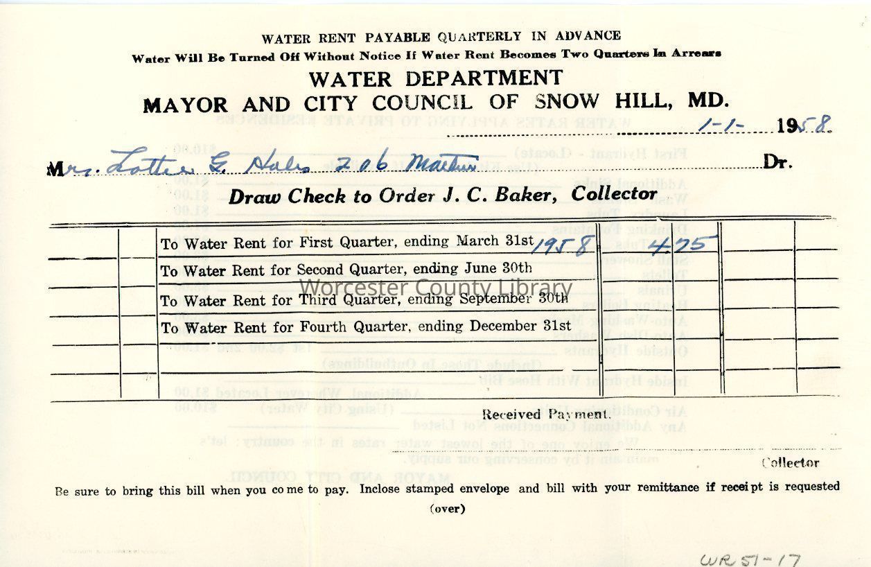 Water invoice, Snow Hill, Jan. 1958Entry/Object ID