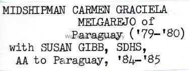 Caption, “Midshipman Carmen Graciela Melgarejo of Paraguay (’79-’80) with Susan Gibb, SDHS, AA to Paraguay, ’84-’85,” Jan 1984Entry/Object ID