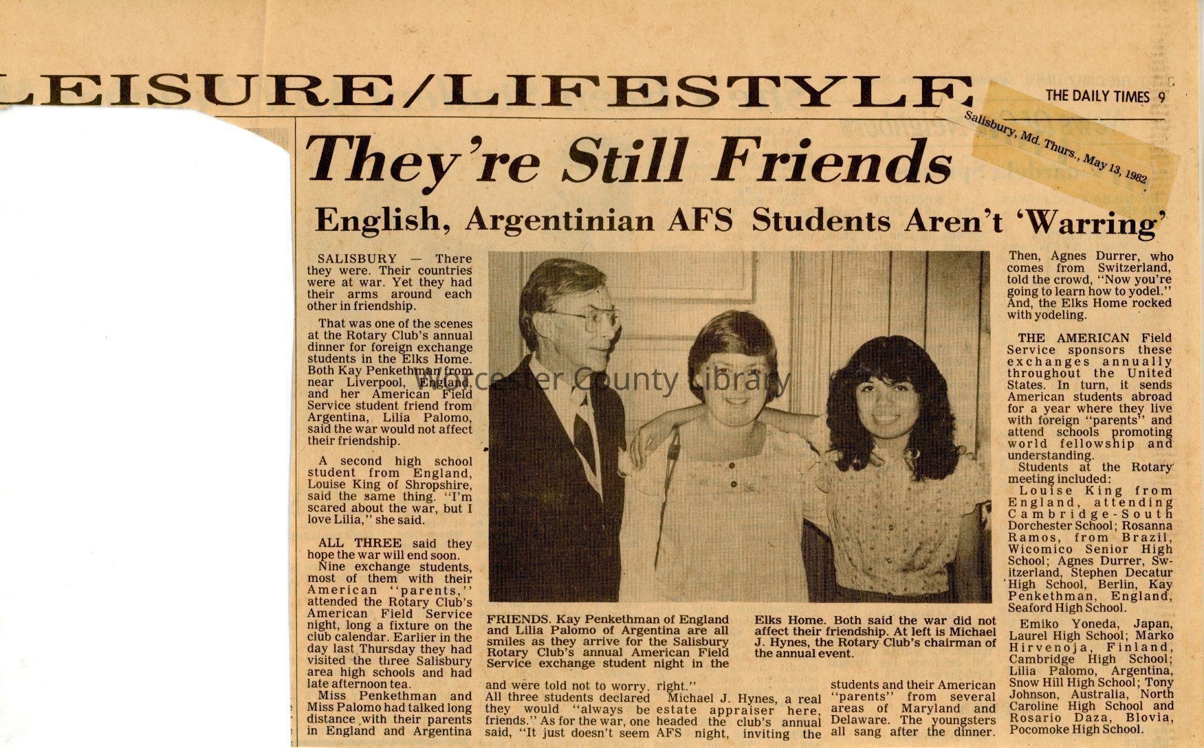 Newspaper clipping, “They’re Still Friends, English, Argentinian AFS Students Aren’t ‘Warring,’” May 13, 1982Entry/Object ID