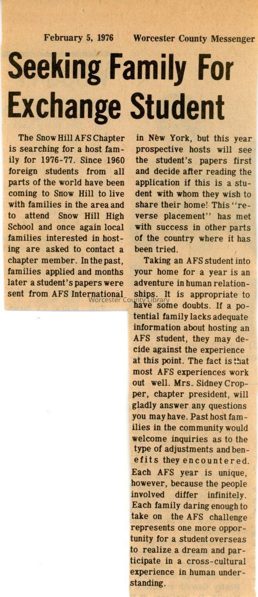 The Snow Hill AFS Chapter is searching for a host family for 1976-77. Since 1960 foreign students from all parts of the world have been coming to Snow Hill to live with families in the area and to attend Snow Hill High School and once again local families interested in hosting are asked to contact a chapter member. In the past, families applied and months later a student's papers were sent from AFS International in New York, but this year prospective hosts will see the student's papers first and decide after reading the application if this is a student with whom they wish to share their home! This "reverse placement" has met with success in other parts of the country where it has been tried.
