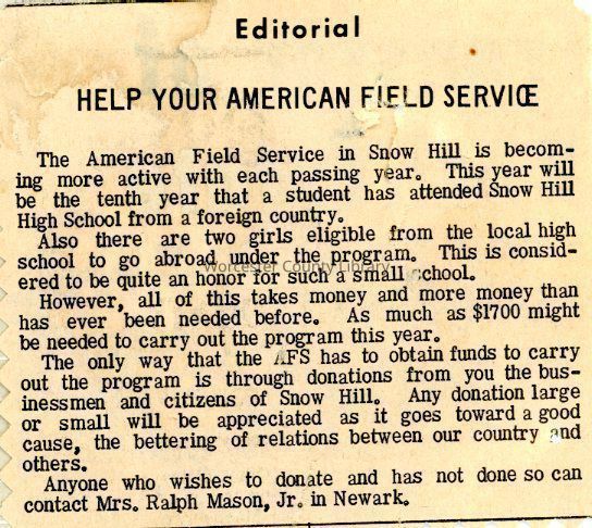 Newspaper clipping, “Editorial: Help Your American Field Service”Entry/Object ID