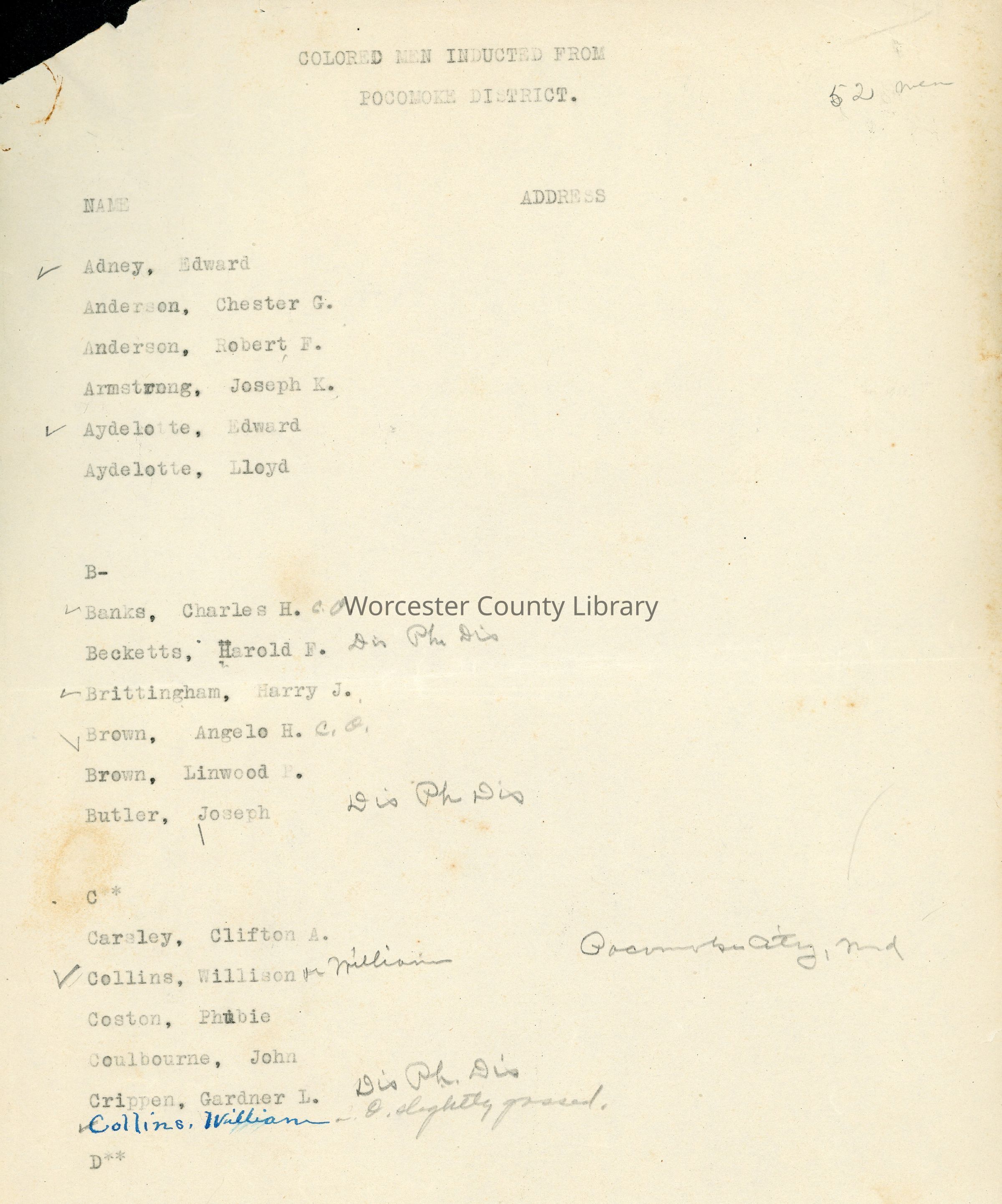 Colored Men Inducted from Pocomoke District, World War IEntry/Object ID