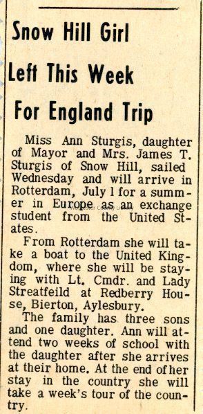 Newspaper clipping, “Snow Hill Girl Left this Week for England Trip” (Ann Sturgis), 1967Entry/Object ID