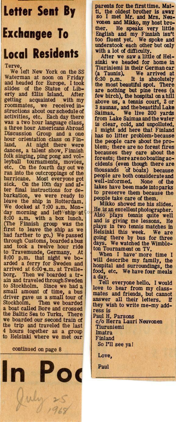 Newspaper clipping, “Letter Sent by Exchangee to Local Residents” by Paul Parsons (2 parts) July 25, 1968Entry/Object ID