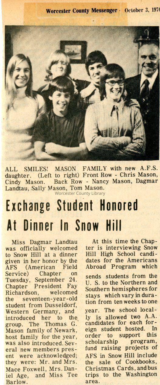 Newspaper clipping, “Exchange Student Honored at Dinner in Snow Hill” (Dagmar Landtau), Oct. 3, 1974Entry/Object ID