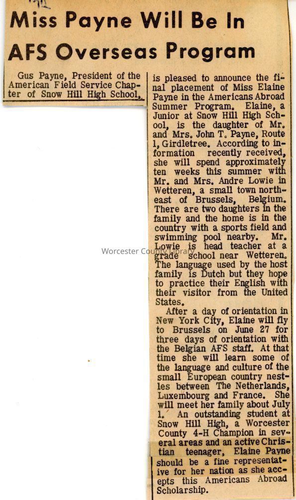 Newspaper clipping, “Miss Payne Will Be in AFS Overseas Program” (Elaine Payne), 1972Entry/Object ID