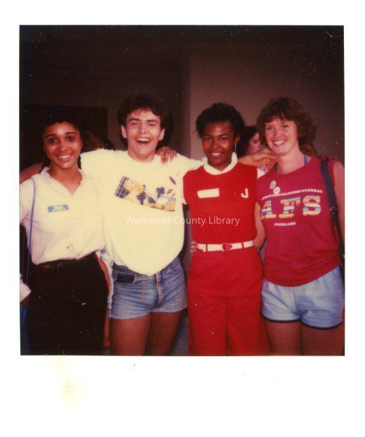 Photograph of 2 unidentified students, Janette, and Jackie Baine at Fondue Gallery, Jun 1984Entry/Object ID