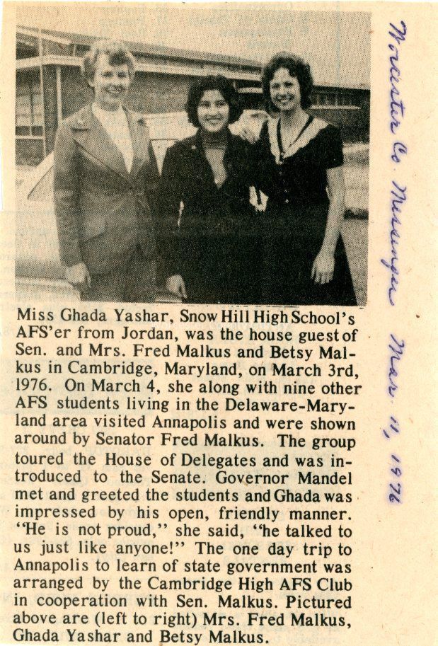 Newspaper clipping, Ghada Yashar’s visit to Senator Malkus’s house, Mar. 11, 1976Entry/Object ID