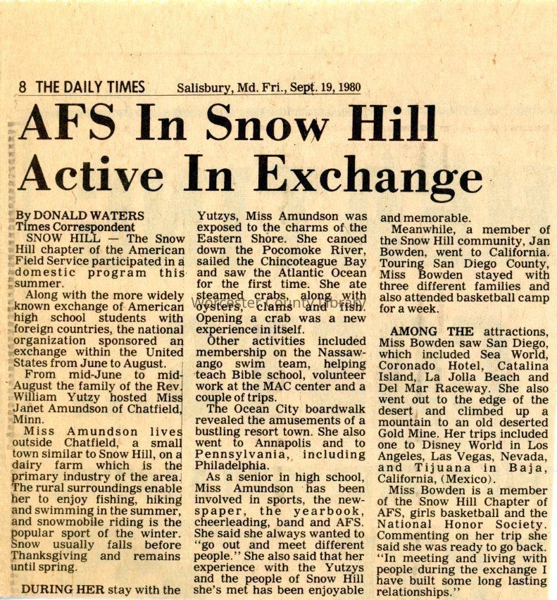 Newspaper clipping, “AFS in Snow Hill Active in Exchange,” Sept. 19, 1980Entry/Object ID