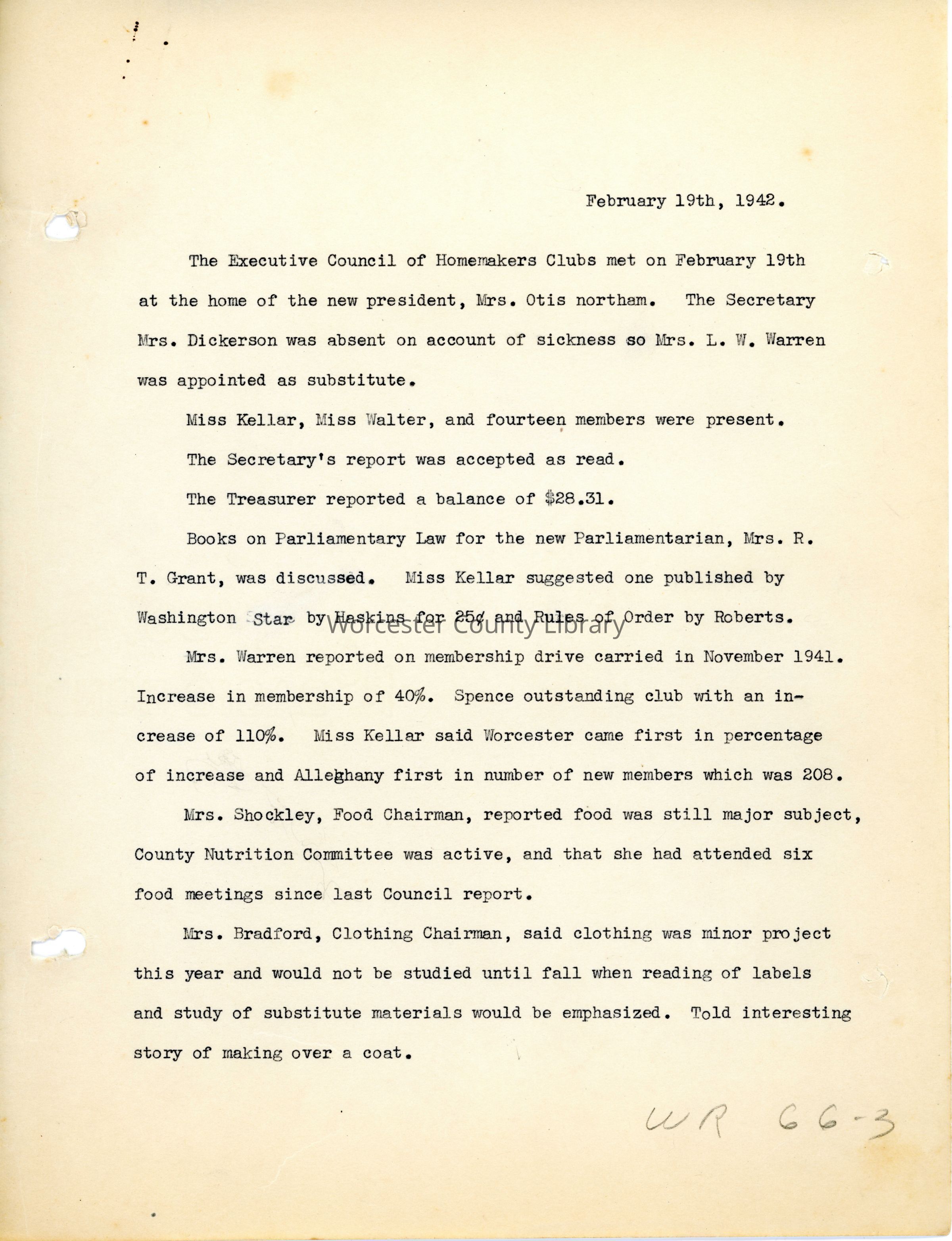 Worcester County Council of Homemakers, Mrs. Lee W. WarrenDate(s) of Creation