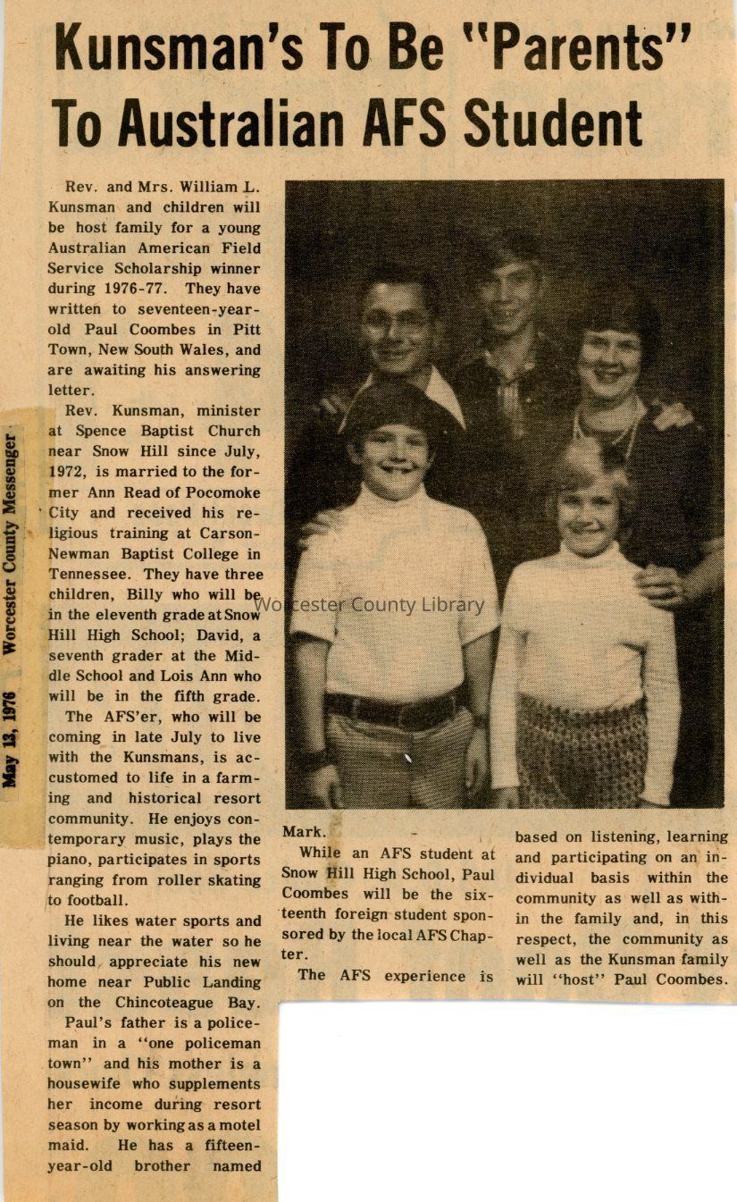 Newspaper clipping, “Kunsman’s to be ‘Parents’ to Australian AFS Student," May 13, 1976Entry/Object ID