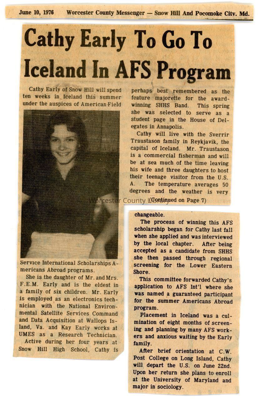 Newspaper clipping, “Cathy Early To Go To Iceland In AFS Program,” June 10, 1976 (4 pieces)Entry/Object ID