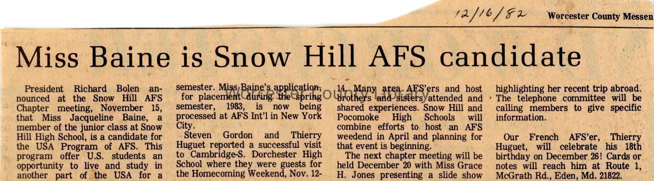 Newspaper clipping, “Miss Baine is Snow Hill AFS candidate,” Dec. 16, 1982Entry/Object ID