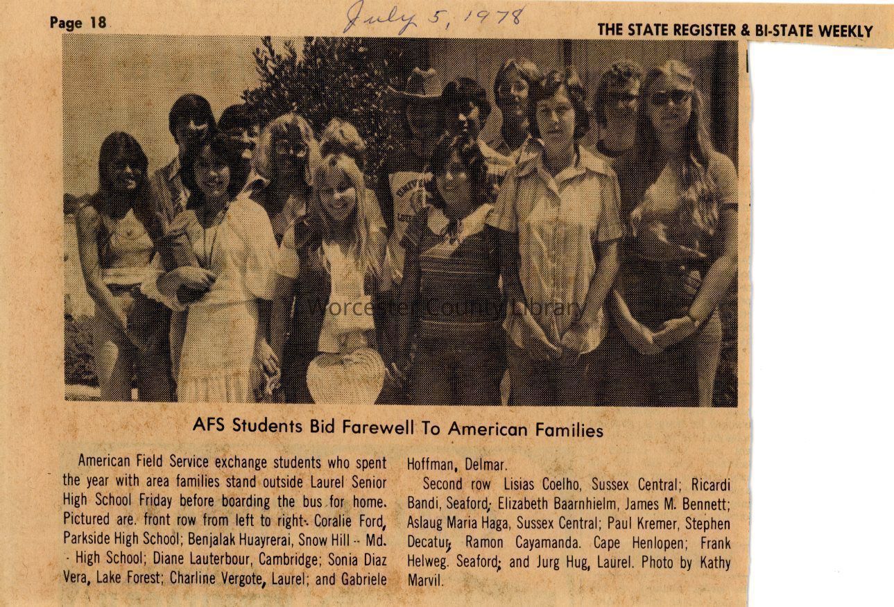 Newspaper clipping, “AFS Students Bid Farewell to American Families,” July 5, 1978Entry/Object ID
