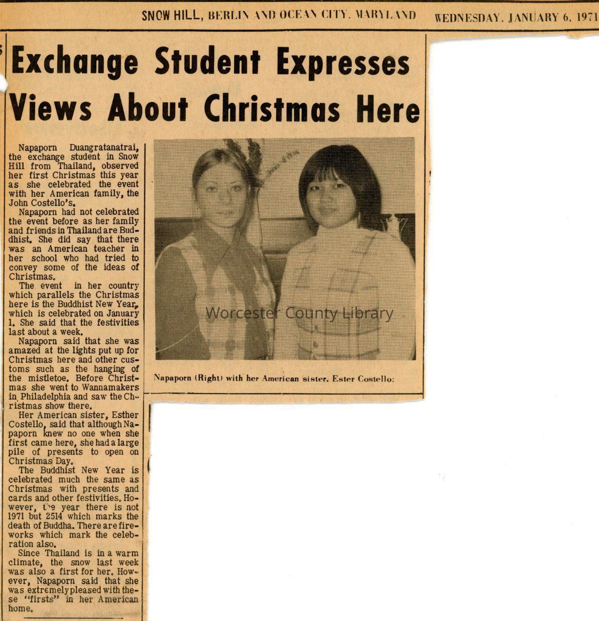 Newspaper clipping, “Exchange Student Expresses Views About Christmas Here”, Jan. 6, 1971Entry/Object ID