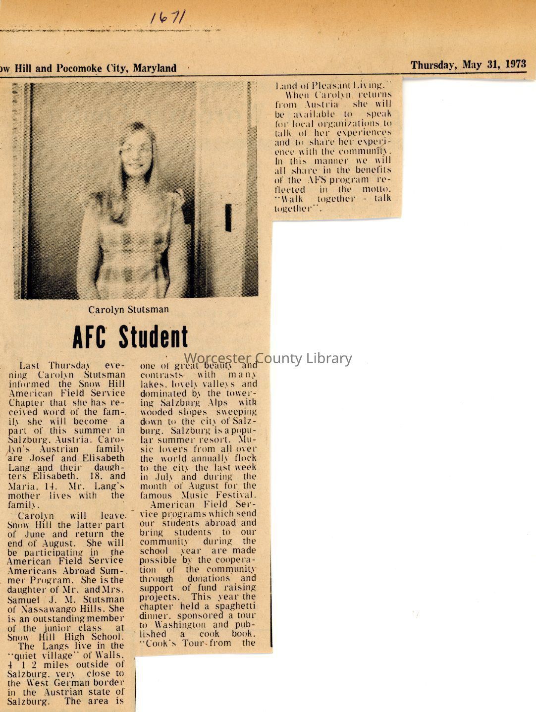 Newspaper clipping, “AFC Student” (Carolyn Stutsman), May 31, 1973Entry/Object ID