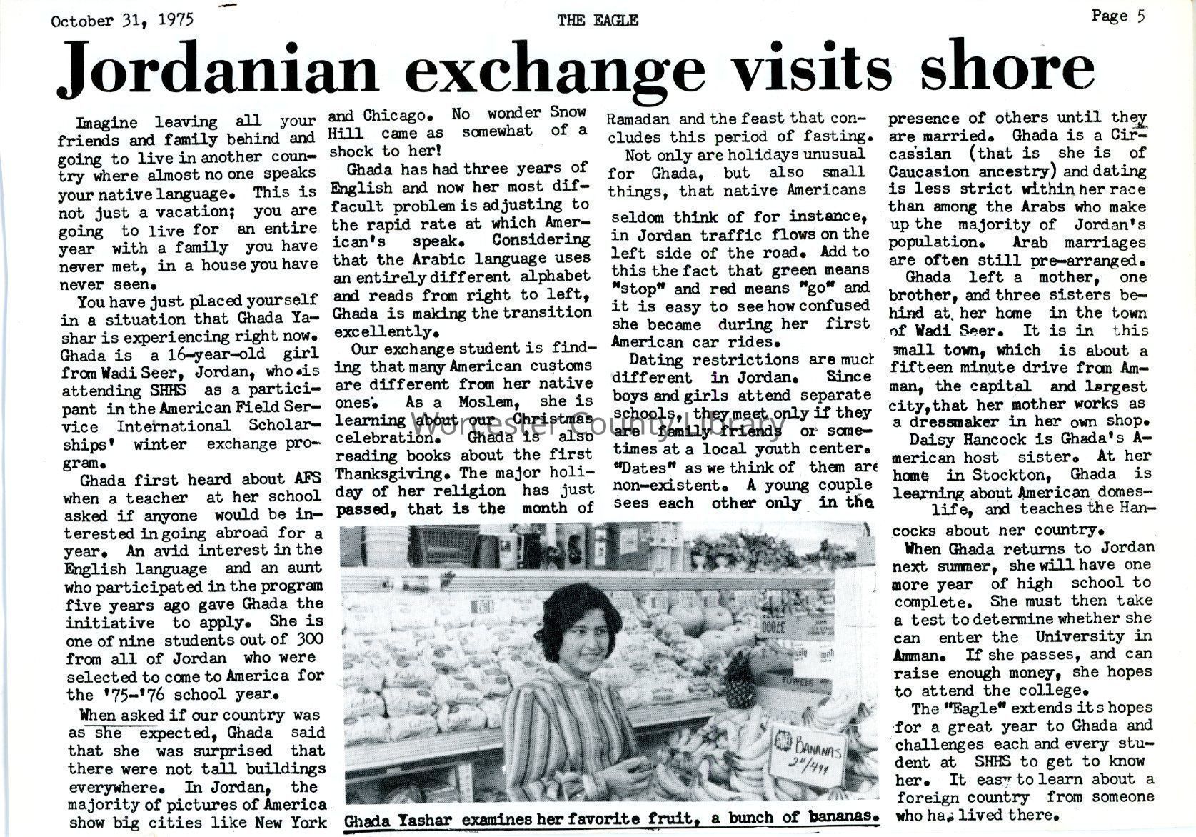Newsletter clipping, The Eagle, “Jordanian exchange visits shore,” Oct 1975Entry/Object ID