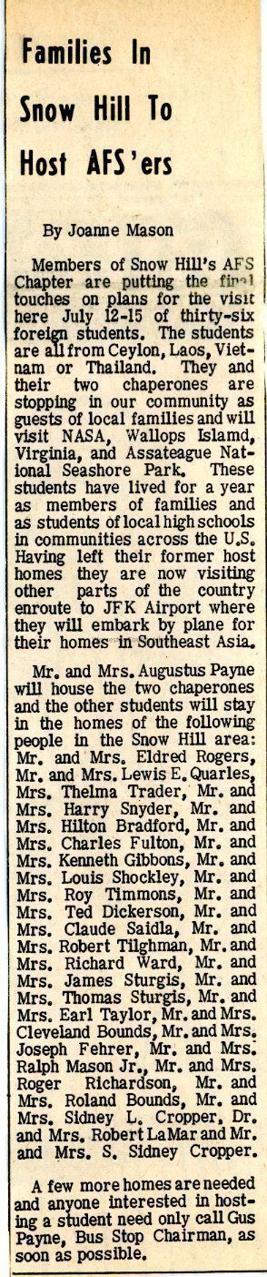 Hilton Bradford, Mabel Eloise Parker Cropper, Sidney Laurence Cropper, Mrs. Sidney L. Cropper, Ted Dickerson, Mrs. Ted Dickerson, Joseph Fehrer, Mrs. Joseph Fehrer, Mrs. Kenneth Gibbons, Lewis Edward Quarles, Helen Uldene Bryant Quarles, Fay Richardson, Eldred Rogers, Mrs. Eldred Rogers, Claude Ryan Saidla, Mrs. Claude Saidla, Harry Snyder, Mrs. Harry Snyder, Frances Bishop Scarborough Sturgis, Thomas Sturgis, Mrs. Thomas Sturgis, Robert Tilghman, Mrs. Robert Tilghman, Richard E. Ward, Martha Ellen Nock Fulton, Charles Robert Fulton, Roland Grant Bounds, Mary Alta Perdue Bounds, James Thomas Sturgis, Sr., Ralph L. Mason, Jr., Joanne Dickerson Mason, Rodney Cleveland Bounds, Jr., Pauline Ellen Cropper Bounds, Mrs. Hilton Bradford, Freda Pauline Maust LaMar, Robert Charles LaMar, Jr., Elizabeth Aline Mumford Payne, Roger Lee Richardson, Loretta Ann Herpel Shockley, Louis William Shockley, Sr., Earl Taylor, Mrs. Earl Taylor, Roy Timmons, Frances Virginia Cropper Timmons, Thelma Doris Disharoon Trader Bloxom, Mrs. Richard E. Ward, Snow Hill High School, American Field Service, NASA Wallops, Assateague National Seashore Park, Kenneth Gibbons