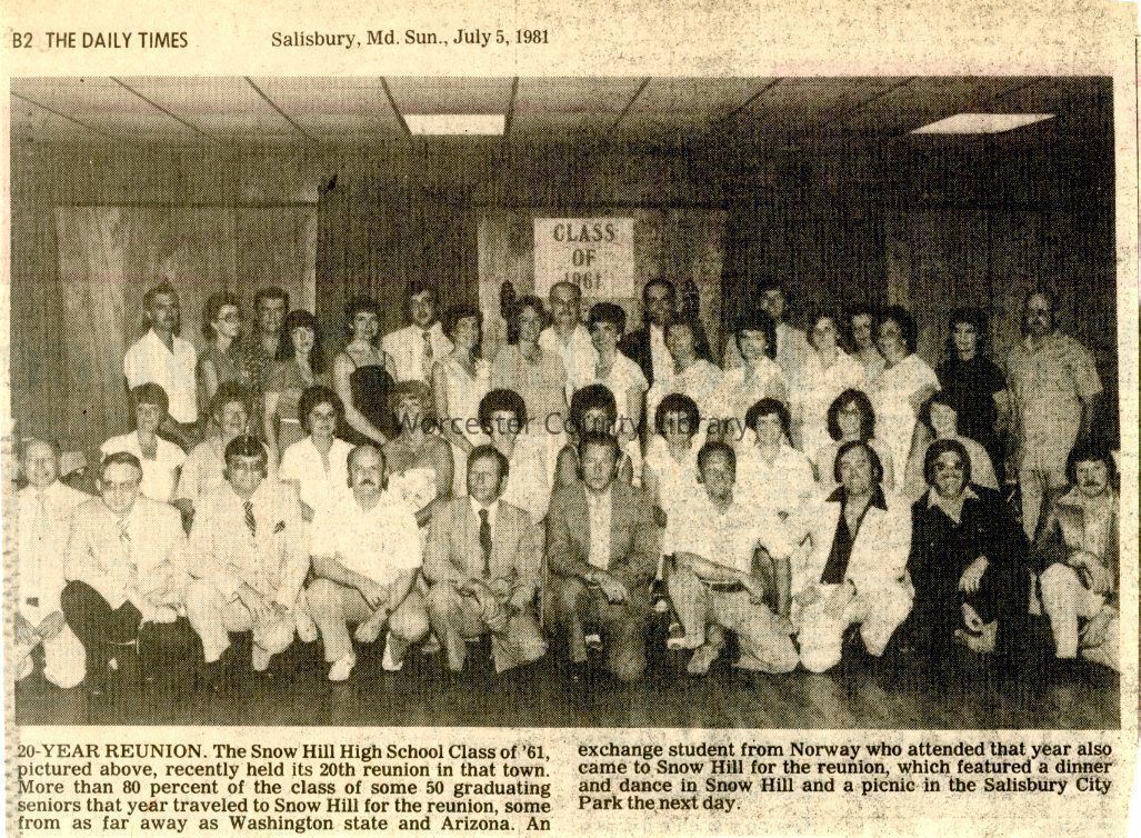 Newspaper clipping, Snow Hill 20 Year Reunion, July 5, 1981Entry/Object ID