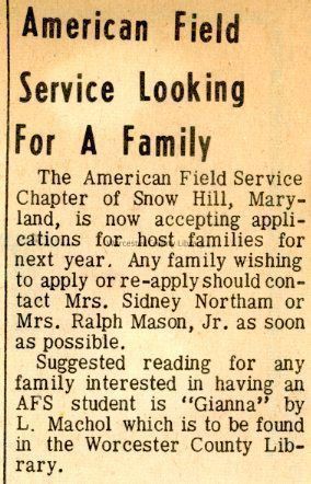 Newspaper clipping, “American Field Service Looking For a Family”Entry/Object ID