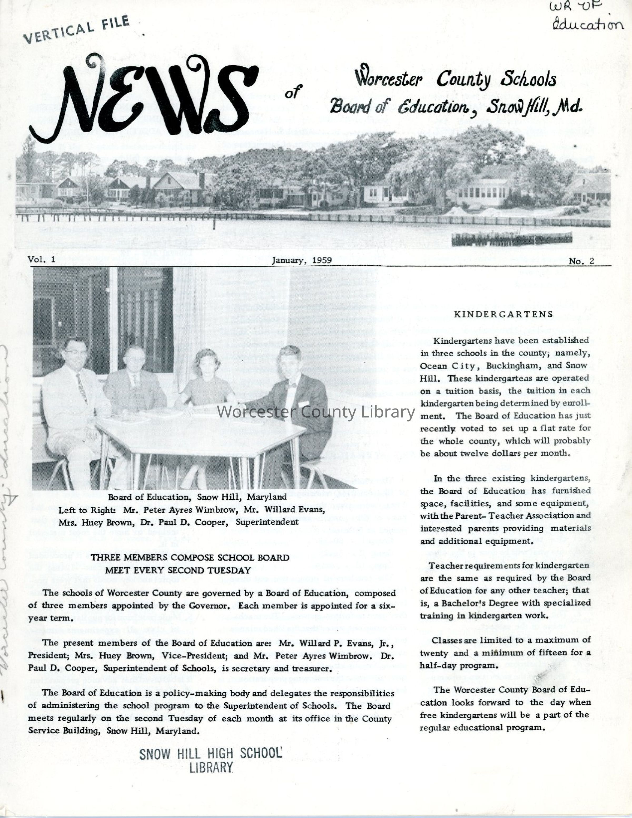 The present members of the Board of Education are: Mr. Willard P. Evans, Jr., President; Mrs. Huey Brown, Vice-President; and Mr. Peter Ayres Wimbrow. Dr. Paul D. Cooper, Superintendent of Schools, is secretary and treasurer.