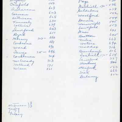 Note with names of nearby towns with last names listed underneath with numbers beside them. Meaning of names and numbers is unknown.