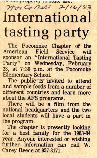 Newspaper clipping, “International tasting party,” Feb. 16, 1983Entry/Object ID