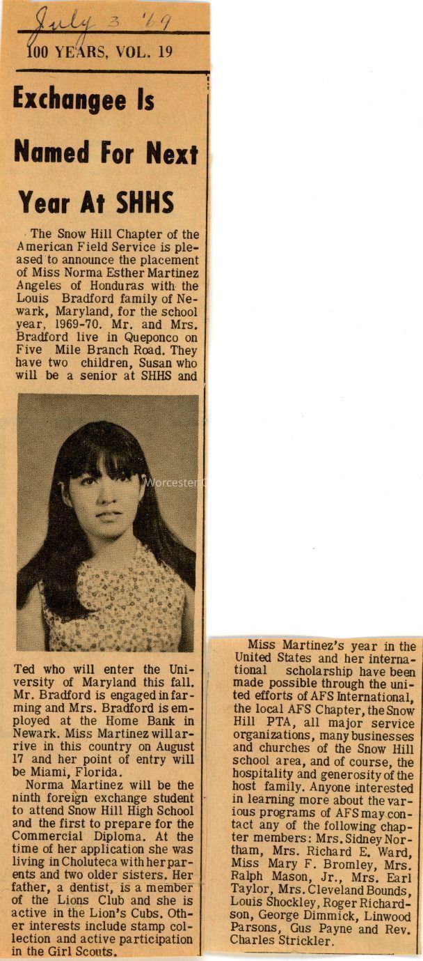 Norma Esther Martinez Angeles Cherrix, Louis Bradford, Mrs. Louis Bradford, Ted Bradford, Mary F. Bromley, George Dimmick, Pauline Ellen Cropper Bounds, Susan Bradford, Joanne Dickerson Mason, Virginia Jewell Burge Northam, Chester Linwood Parsons, Sr., Augustus William Payne, Roger Lee Richardson, Louis William Shockley, Sr., Charles Strickler, Mrs. Earl Taylor, Mrs. Richard E. Ward, Snow Hill High School, American Field Service, Snow Hill Lions Club, Girl Scouts of America, Snow Hill Parent-Teacher Association
