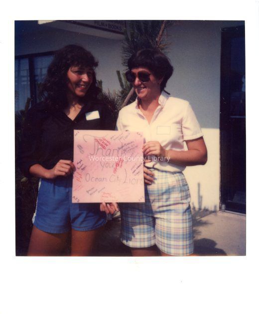 Photograph of Azy Durrer and unknown person holding ‘Thank you Ocean City Lions’ signEntry/Object ID