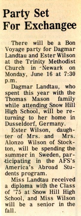 Newspaper clipping, “Party Set for Exchangee” (Dagmar Landtau and Esther Wilson), 1975Entry/Object ID
