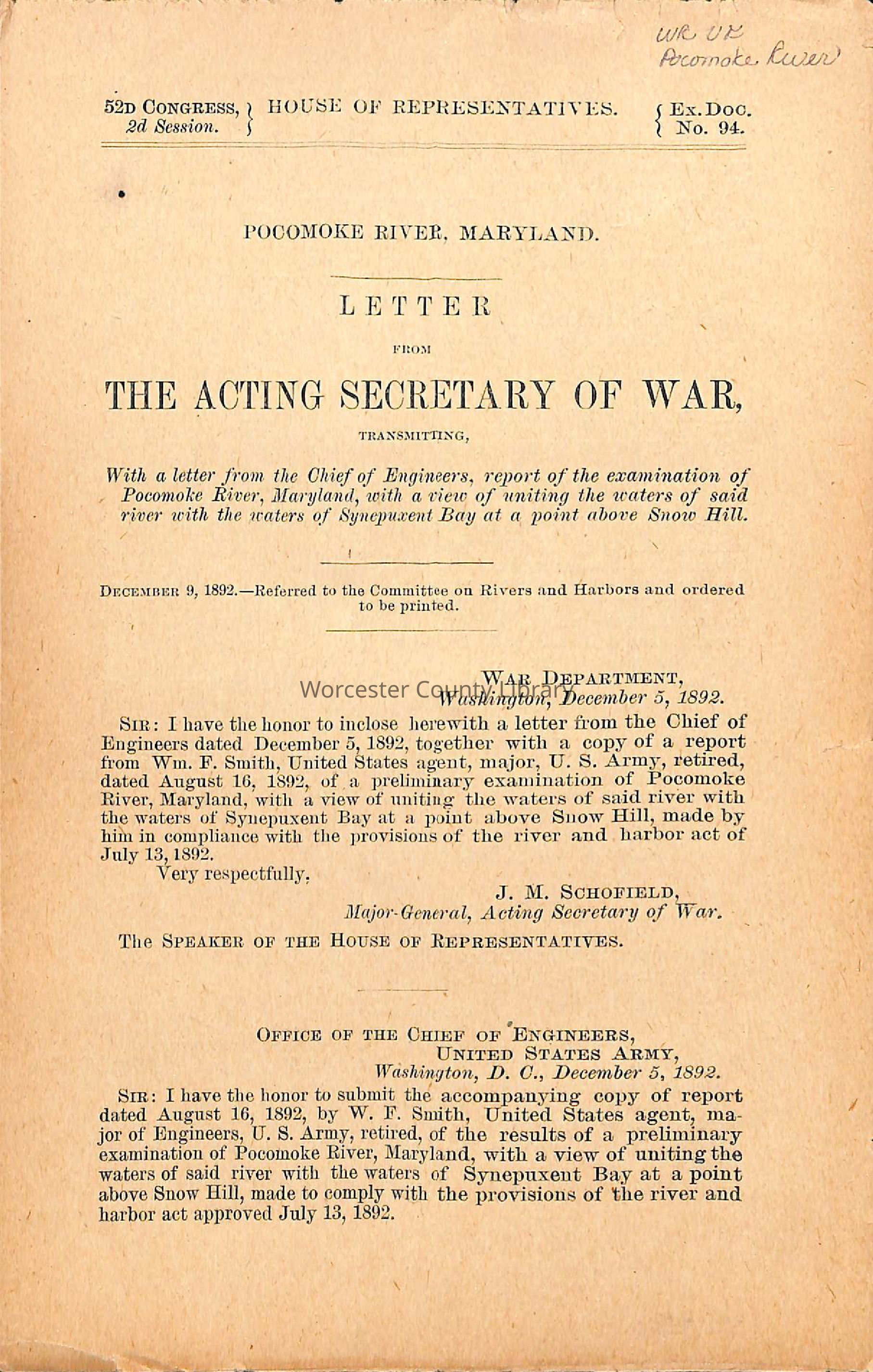 SIR: I have the honor to inclose herewith a letter from the Chief of Engineers dated December 5, 1892, together with a copy of a report from Wm. F. Smith, United States agent, major, U. S. Army, retired, dated August 16, 1892, of a preliminary examination of Pocomoke River, Maryland, with a view of uniting the waters of said river with the waters of Synepuxent Bay at a point above Snow Hill, made by him in compliance with the provisions of the river and harbor act of July 13, 1892.