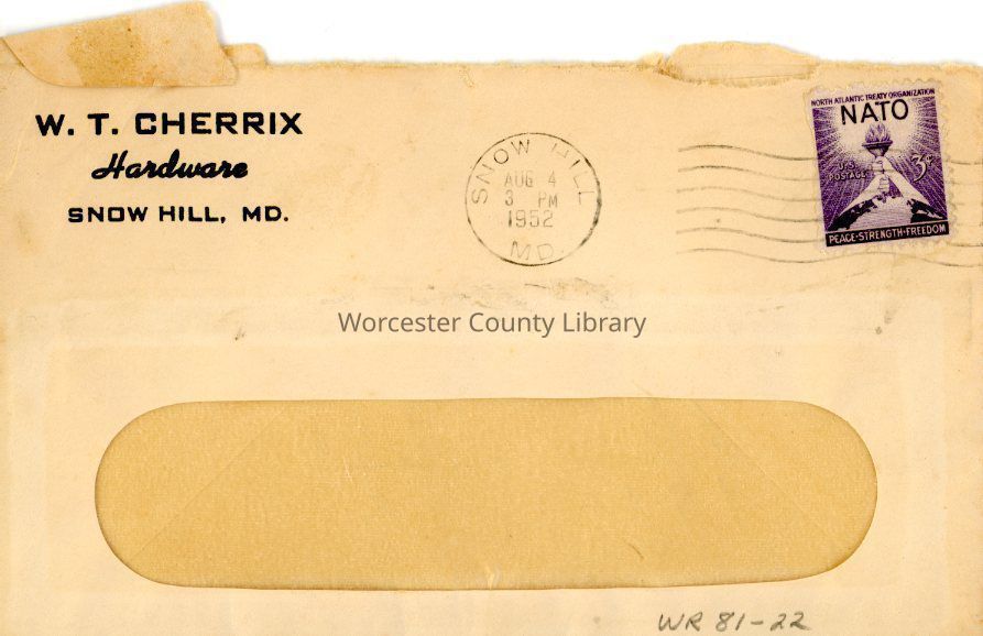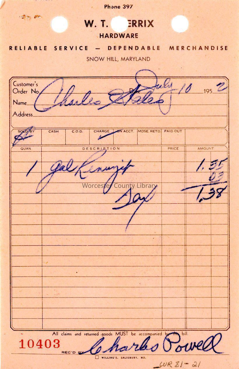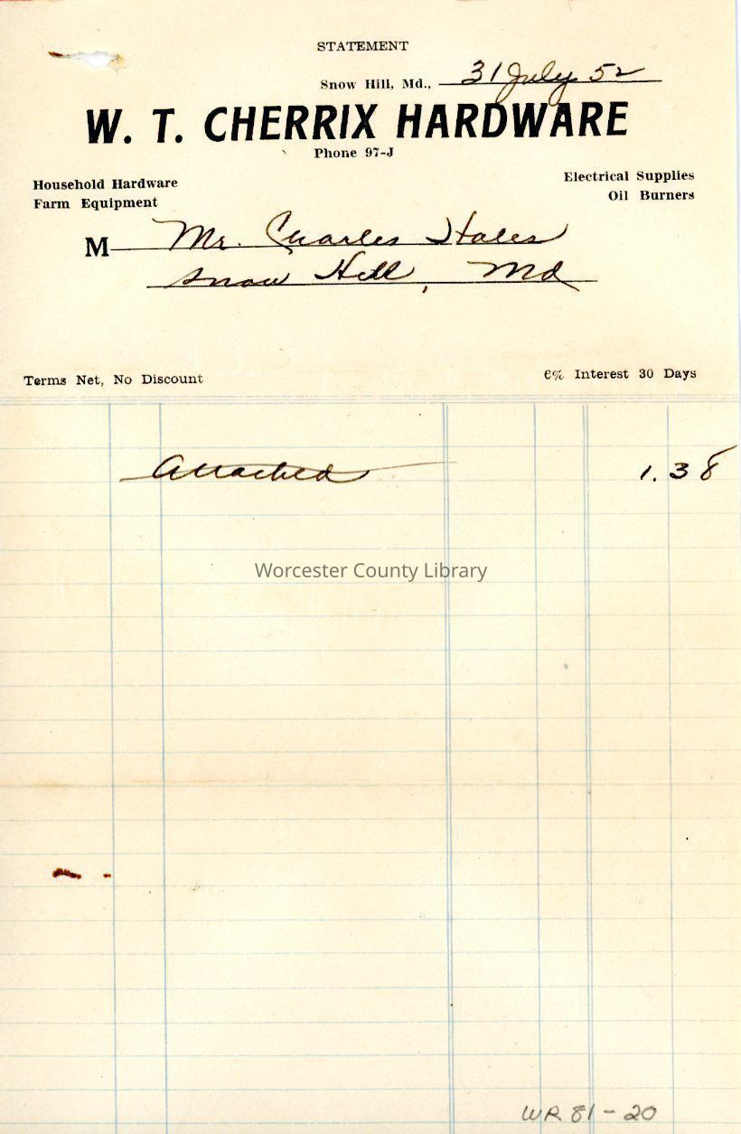 Statement, receipt, and envelope, W. T. Cherrix Hardware, July & Aug. 1952Entry/Object ID