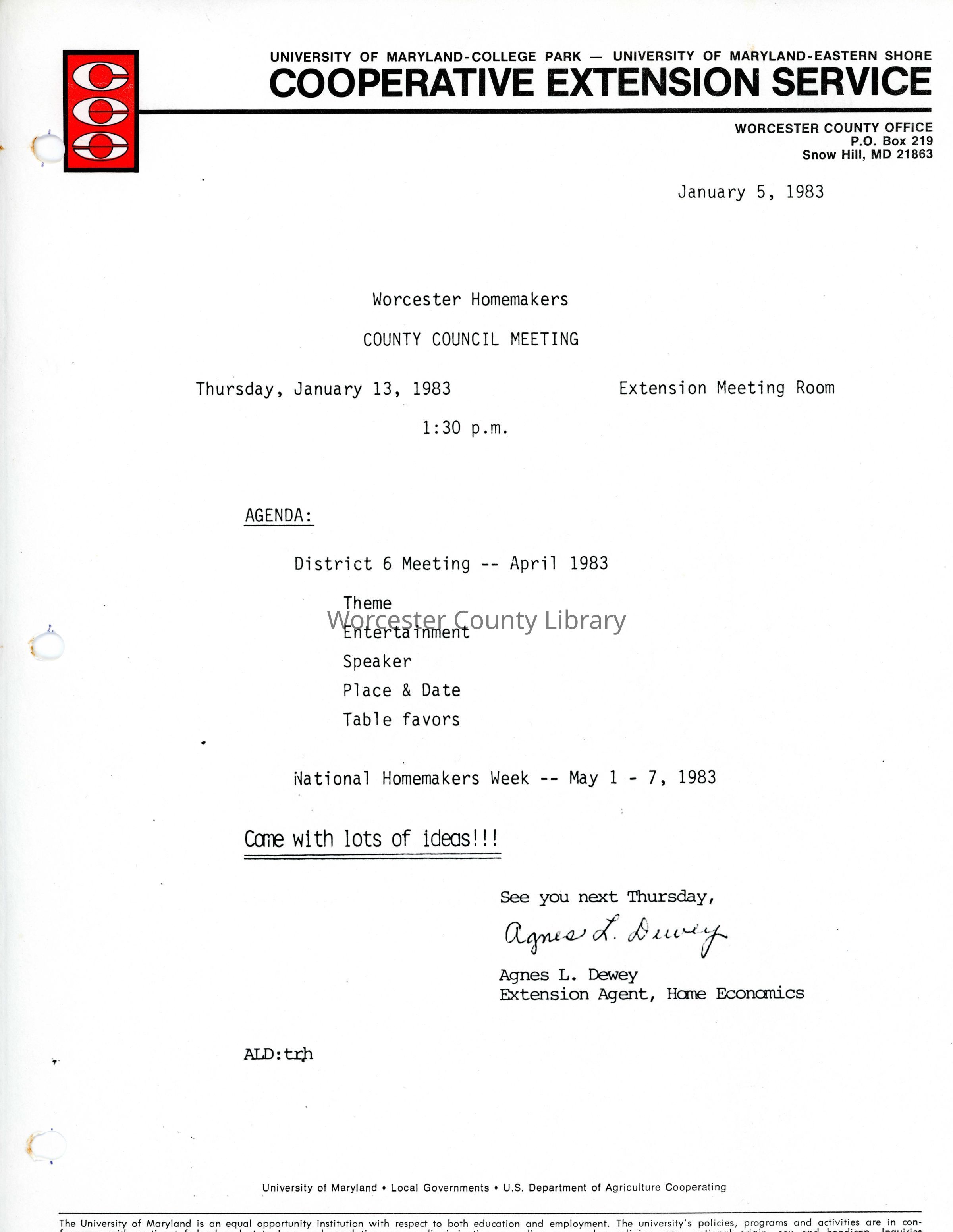 Worcester County Council of Homemakers, Sandy Facinoli, University of Maryland Extension OfficeDate(s) of Creation